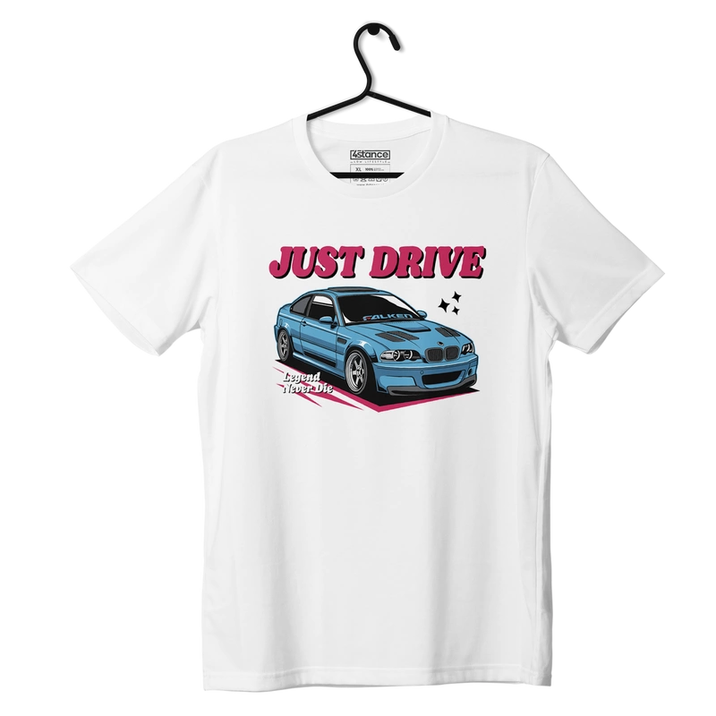Na bílém pozadí trička je grafika inspirovaná ikonickým modelem BMW E46, který je symbolem německého inženýrství a designu. Nápis "Just Drive" zdůrazňuje filozofii značky a vášeň pro řízení.