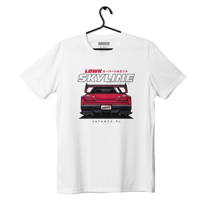 - Bílé tričko s grafikou Nissan Skyline R34 LWBK pro fanoušky automobilů. Je vyrobeno ze 100% bavlny a k dispozici v různých velikostech