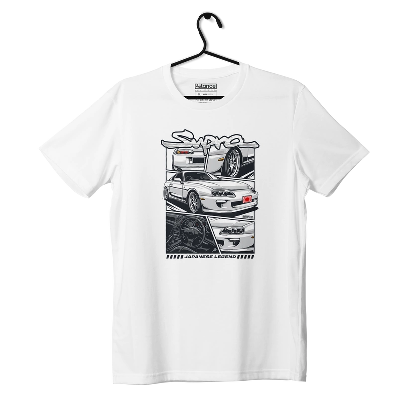 - Bílé tričko s grafikou inspirovanou mangou a vyobrazením modelu Toyota Supra. Vyrobeno ze 100% bavlny a k dispozici v různých velikostech.