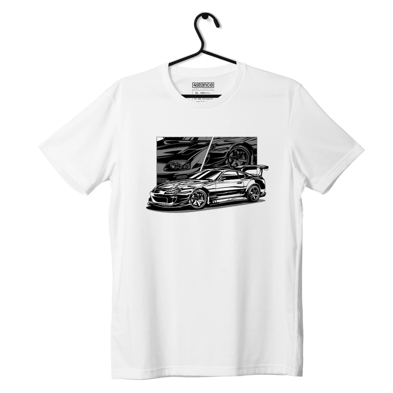 - Zcela nové bílé tričko s černobílým potiskem Toyota Supra mk4. Vyrobeno ze 100% bavlny, ideální pro fanoušky motorismu. K dispozici v různých velikostech.