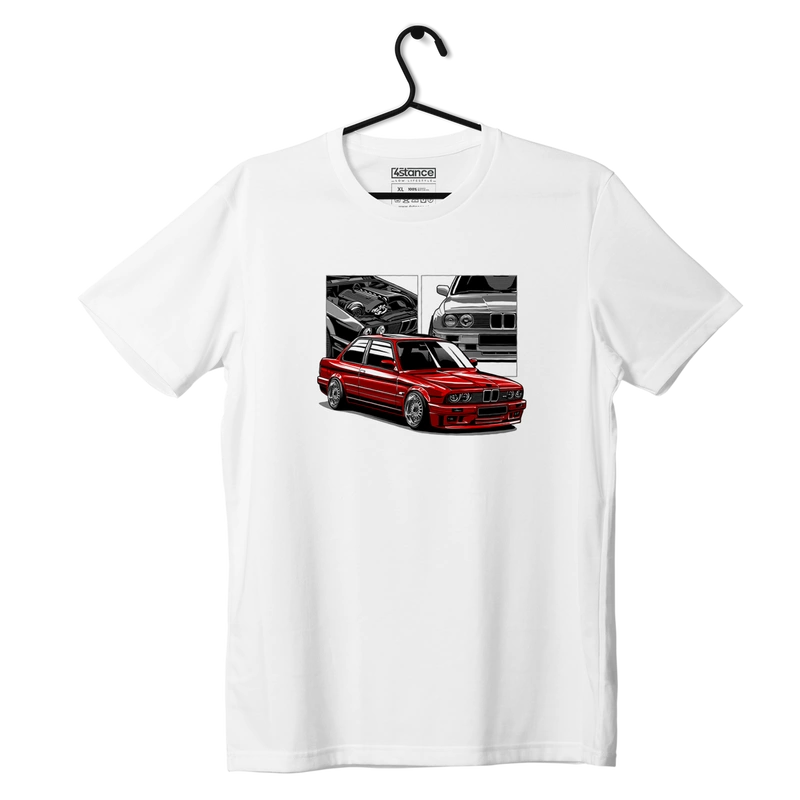 - White t-shirt with red BMW E30 M3 print for car lovers. Comfortable, durable, made of cotton. Express your passion!