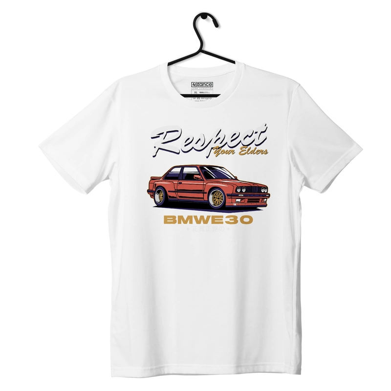 - The white BMW E30 Respect T-shirt is an excellent choice for car lovers. Made of 100% cotton and featuring the BMW logo, it highlights your passion for automobiles.
