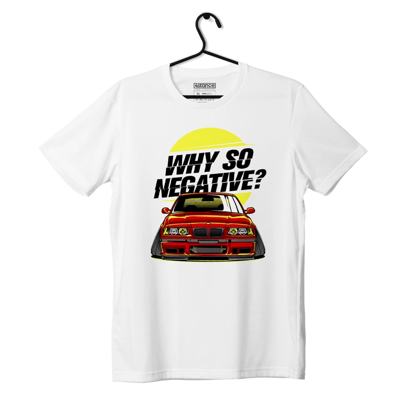 The E36 is a true automotive icon, which fans around the world appreciate for its unique design and unparalleled performance. Our white T-shirt with the BMW E36 logo WHY SO NEGATIVE? is a tribute to this legendary model that is sure to attract the attention of anyone who sees it.