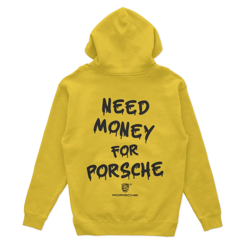 - The yellow hoodie "Need Money for Porsche" is a comfortable and stylish piece of clothing for car enthusiasts, made from cotton and polyester.