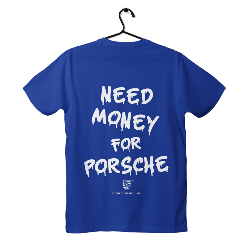 - The blue "Need Money for Porsche" t-shirt is an ideal choice for car enthusiasts. Made from 100% cotton, it is comfortable and stylish.