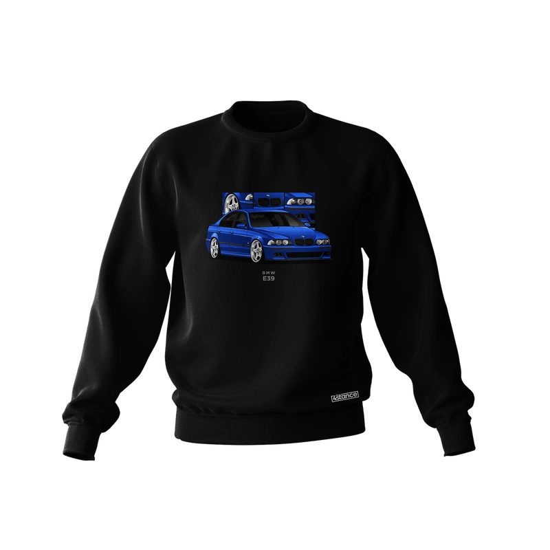 Black BMW E39 sedan blue sweatshirt