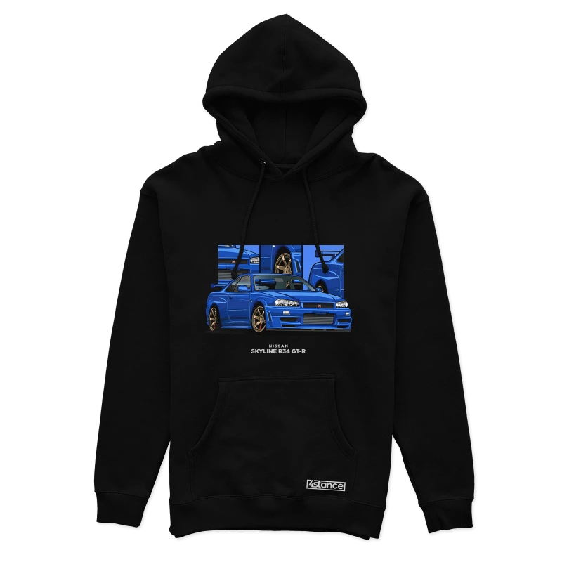 The hoodie is decorated with the logo of the NISSAN SKYLINE R34, a legendary car that has captured the hearts of many car enthusiasts around the world. It's not just a piece of clothing, it's a manifestation of your love for speed, power and style.