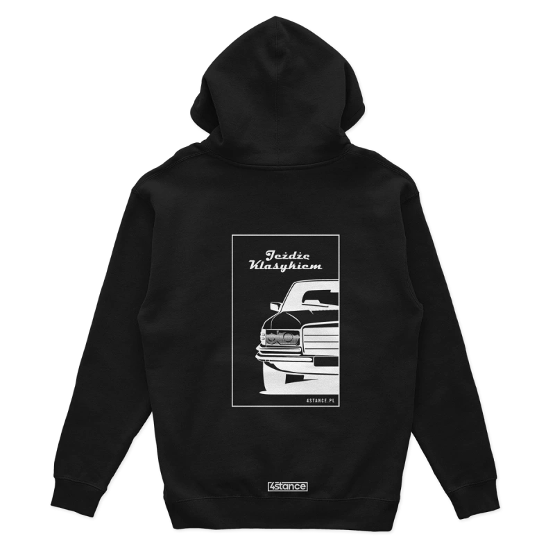 The front of the kangaroo hoodie features the classic MERCEDES W116, one of the most iconic models in automotive history. On the background of the black sweatshirt, the white print of the car draws attention to itself and emphasizes your passion for classics. In addition, the sleeve features the inscription "I drive a classic", which further emphasizes your love for old cars.