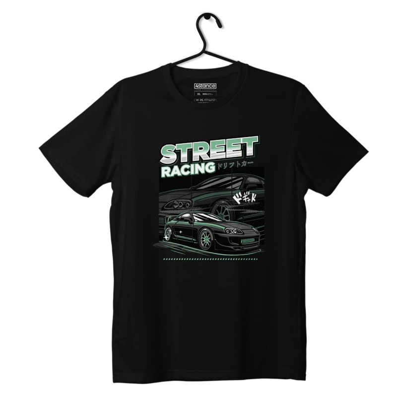 - The black TOYOTA SUPRA MK4 STREET RACING T-shirt is a gadget for automotive fans, with a stylish print of the Toyota Supra MK4 model and the words "Supra MK4".