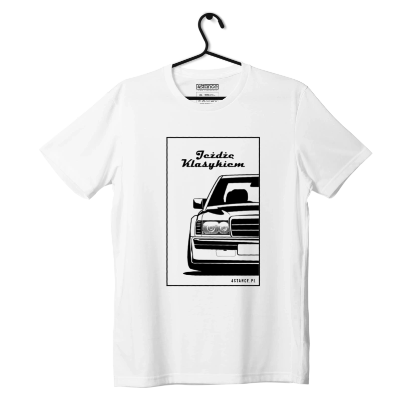 The design of our T-shirt combines a classic style with a modern approach to motoring. The white background features a black print with the outline of a MERCEDES W201 car and the words "I drive a classic". This is a clear signal to others that you are a true automotive fan and appreciate classic models.