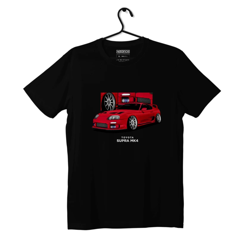 Auf der Vorderseite des T-Shirts befindet sich ein einzigartiger Aufdruck, der den legendären TOYOTA SUPRA MK4 zeigt. Diese Automobilikone ist ein Symbol für Kraft, Geschwindigkeit und exzellentes Design. Seine markanten Linien und sein aggressiver Look werden die Aufmerksamkeit jedes Autoliebhabers auf sich ziehen.