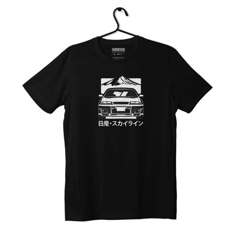 Auf der Vorderseite des T-Shirts befindet sich ein einzigartiges Siebdruckmotiv, das das kultige NISSAN R33-Modell darstellt. Dieses auffällige schwarz-weiße Design erinnert an die japanische Autokultur und ist ideal für Fans des JDM-Stils.