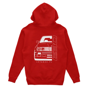 BMW E30 Kapuzenpulli mit roter Front - perfekt für echte Autofans!