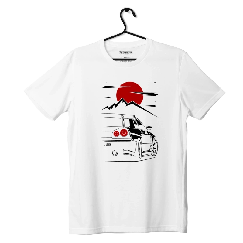 Das Design dieses T-Shirts ist ein absoluter Leckerbissen für Fans des Nissan R34. Auf der Vorderseite des T-Shirts befindet sich eine große, detaillierte Berggrafik, die an japanische Landschaften erinnert - ideal für Drifting. Der Kontrast zwischen dem Weiß des T-Shirts und dem schwarzen Druck macht das Design wirklich auffällig und verleiht Ihrem Stil einen einzigartigen Charakter.
