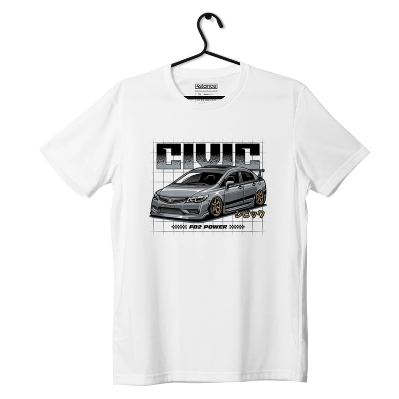 Design naszej koszulki to hołd dla kultowego modelu Honda Civic. Na białym tle koszulki prezentuje się logo marki Honda i grafika modelu Civic FD. Wygląd jest czysty, minimalistyczny, a jednocześnie wyraźnie nawiązuje do kultury jdm, stance, drift.