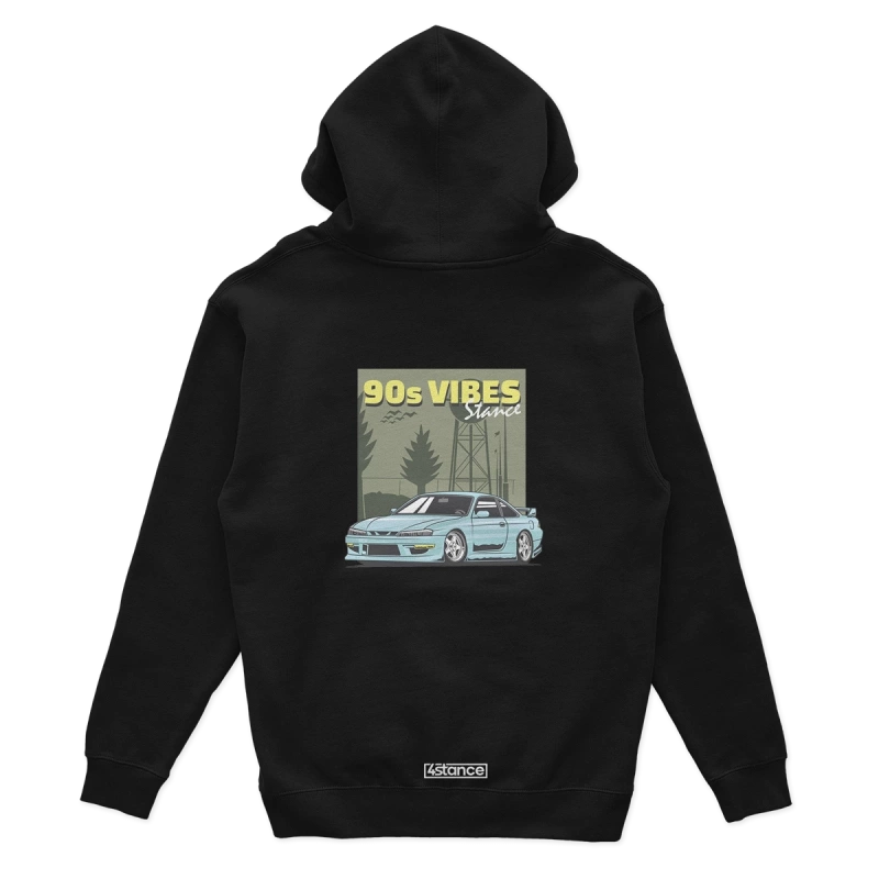 Wyróżnij się z tłumu i pokaż swoją miłość do kultury JDM z naszą czarną bluzą z kapturem NISSAN S14 90s VIBES.
