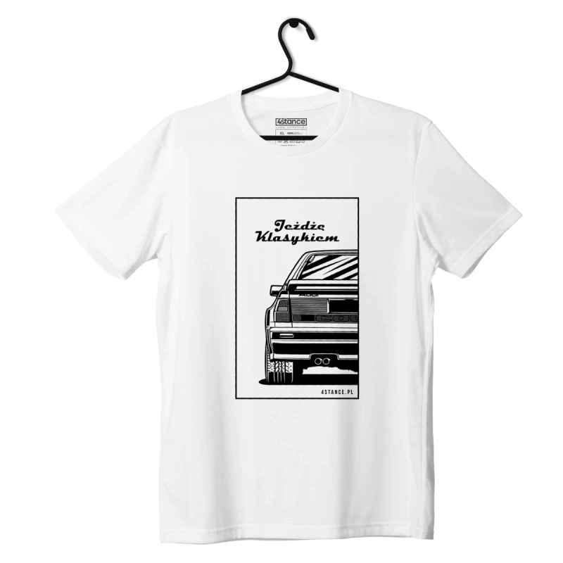 - Biały T-shirt z motywem Audi 100 C4 to must-have dla fanów motoryzacji. Wykonany z wysokiej jakości bawełny, z trwałym nadrukiem "Jeżdżę Klasykiem".