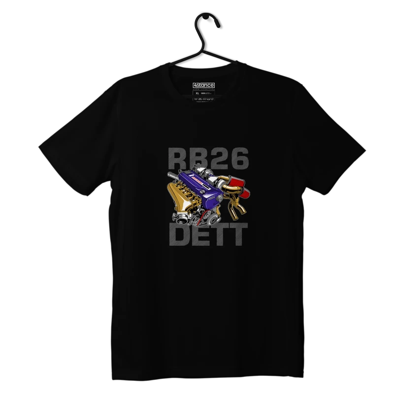 Na przodzie koszulki znajduje się unikalny nadruk silnika RB26 DETT, który jest symbolem mocy, wydajności i technologii. To jest to, czego szukasz - autorytatywnego wyrazu Twojej pasji do motoryzacji.