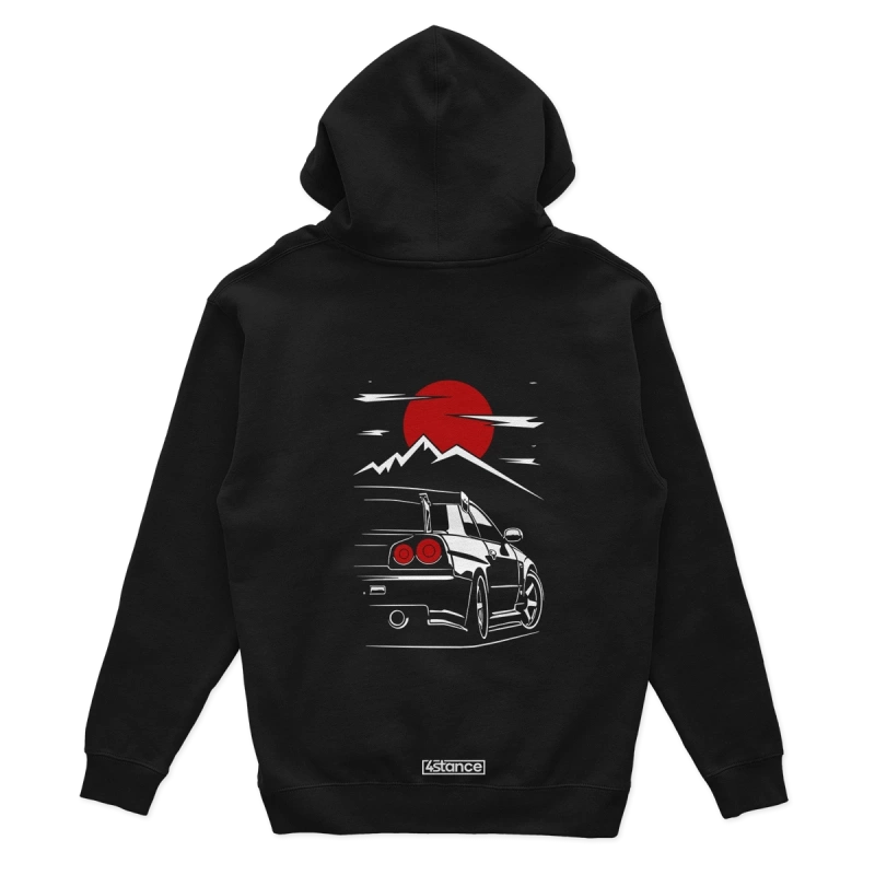 Na prednej strane mikiny je grafika zobrazujúca Nissan R34 na pozadí hôr, čo je odkaz na japonskú krajinu, domov štýlu JDM. Práve tu sa zrodila kultúra Stance a Drift, ktorej ste fanúšikom. Dizajn mikiny je poctou týmto tradíciám.