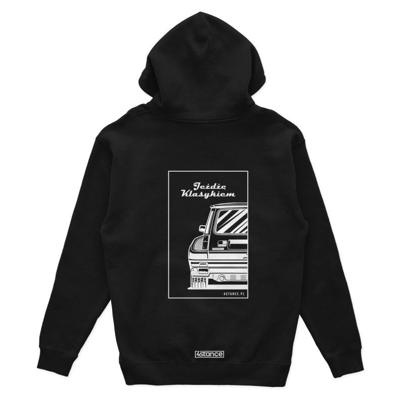 Mikina je vyrobená z vysokokvalitných materiálov, ktoré zaručujú pohodlné celodenné nosenie. Robustná potlač na prednej strane zobrazuje ikonický model Renault 5 s nápisom "I drive a classic", ktorý je dokonalým doplnkom štýlu JDM, stance, drift.