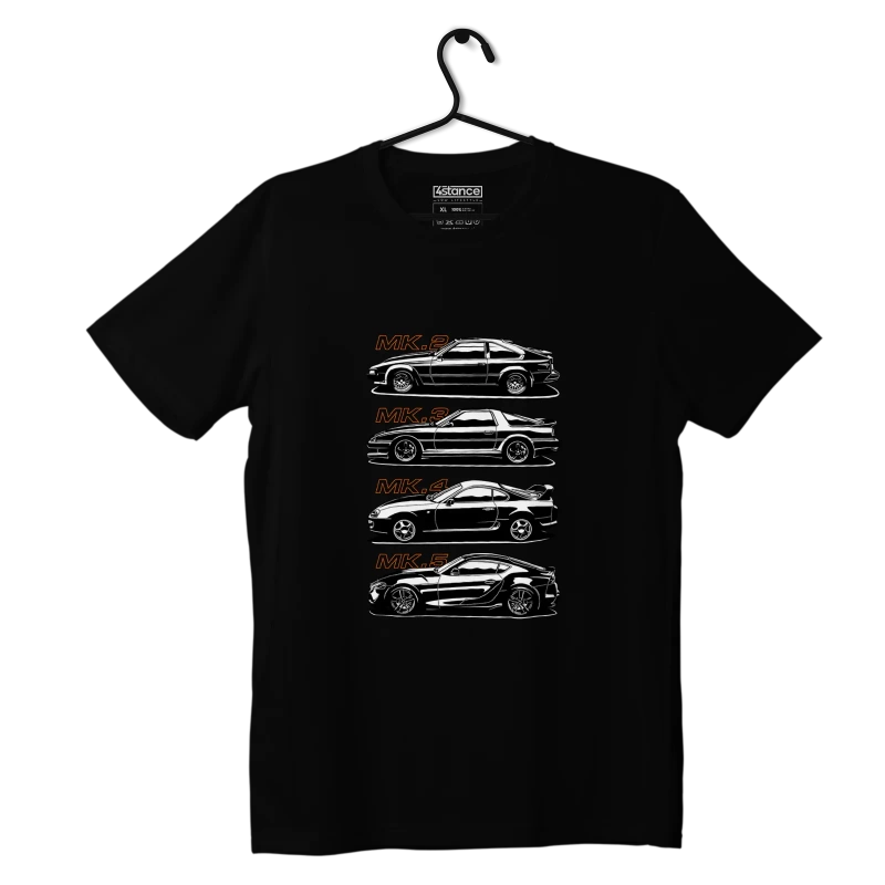 Toto čierne tričko nie je len obyčajné tričko, je to skutočná automobilová história. Na prednej strane sa nachádza jedinečná potlač zobrazujúca vývoj legendárneho modelu Toyota Supra. Od prvej generácie až po najnovšiu inkarnáciu vzdáva toto tričko hold tomuto ikonickému automobilu.